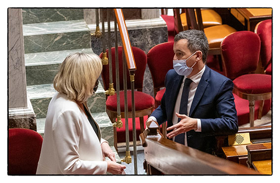 16h Assemblée Nationale: Gerarld Darmanin et Marine Le Pen en discussion avant le débat sur la loi le respect des principes de la République.