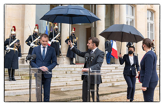 13h15 Le Président Emmanuel Macron tient le parapluie du Premier Ministre Slovaque Igor Matovic